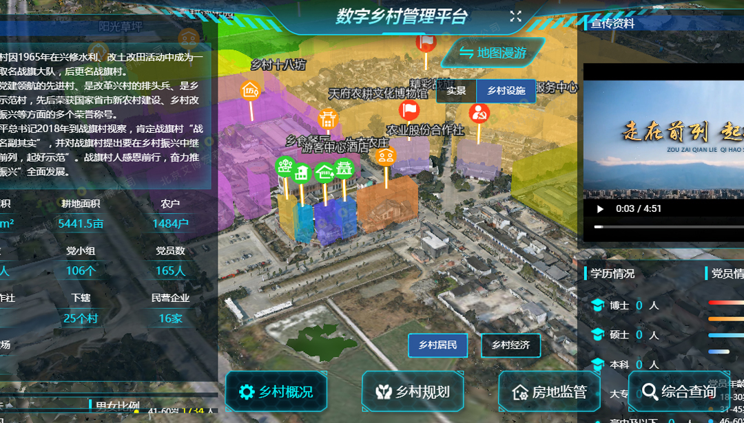 依据乡村振兴建设主导思想,打造集综合性服务门户、乡村文明文旅、社会化服务、自然资源管理、智慧农业、产业数字化、人才数字化、宅基地管理、三资管理以及数字乡村博物馆等矩阵,利用天、空、地一体化数字结合,全面实现美丽乡村数字化提升……